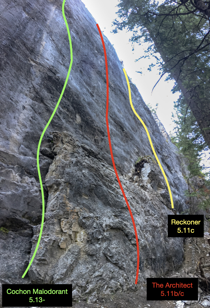 Acephale is a steep and difficult limestone crag near Canmore. You will find Short (15-25 meter) HARD routes here, although a few longer routes can be found at the Lower Wall. Difficulties range from 5.11 to 5.15b. This cliff is home to the some of the hardest climbs in the country.