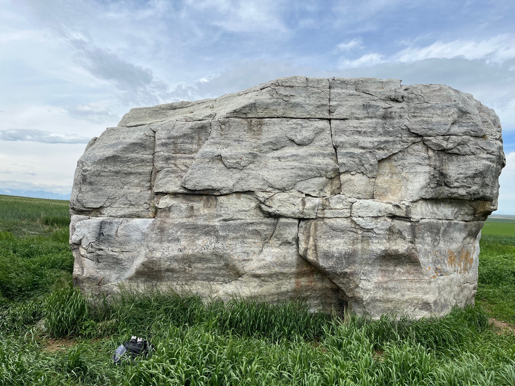 The Glenwood Erratic is a large glacial erratic located about an hour and a half southwest of Lethbridge. The boulder is roughly the shape of a cube, about 18 feet high with a flat top and nice landings. The sides of the boulder are mostly vertical, so most of the 30 or so problems are in the easy to moderate range.