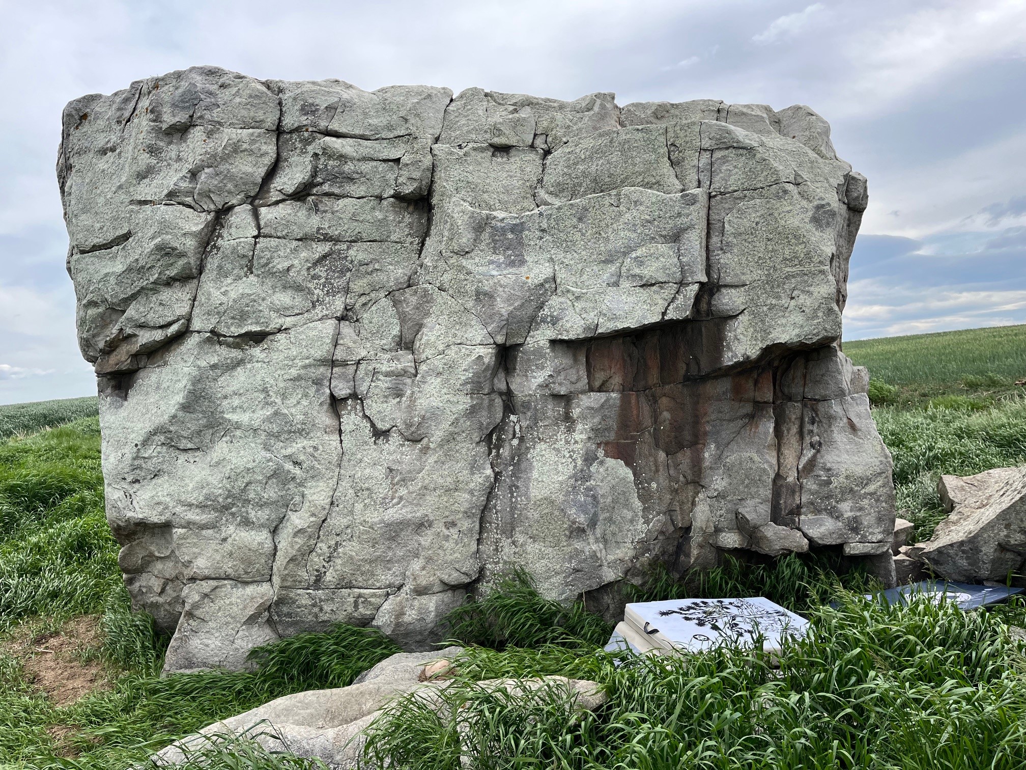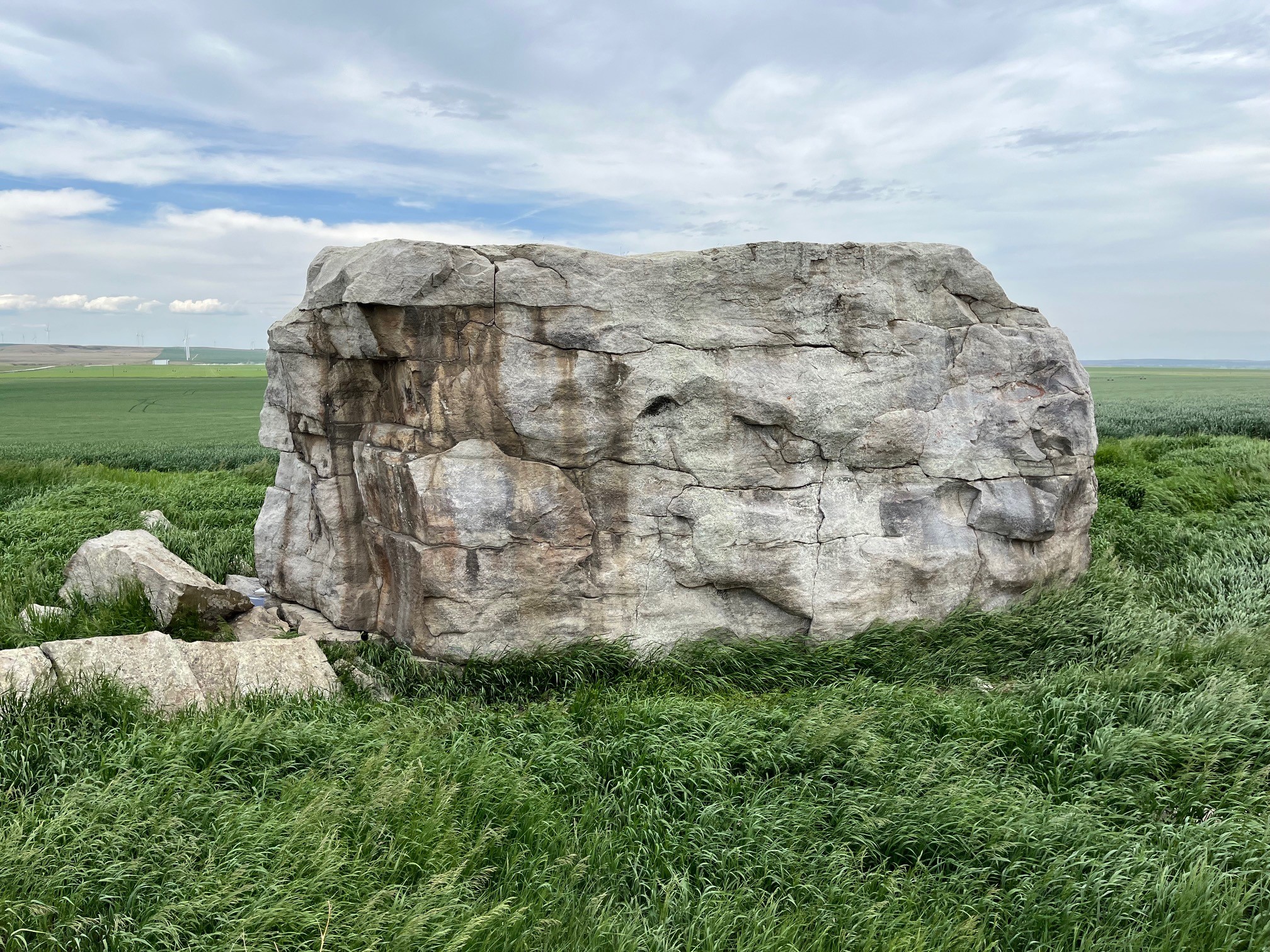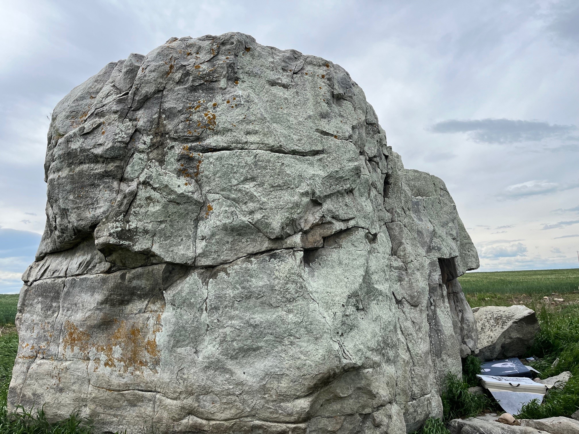 The boulder is located about 40 minutes south of Fort MacLeod. From Highway 3 take AB-810 South for 34.4 km (21.4 mi). Turn left onto Township Road 55, drive for 3.2 km (2.0 mi), then turn right onto Range Road 264. Park on the side of the road after 0.8 km (0.5 mi). The boulder is visible from the road in the field to the east.
