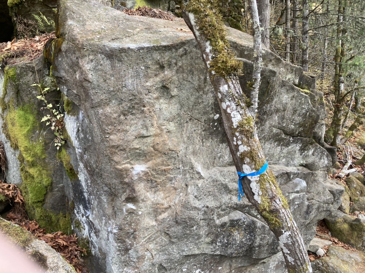 The path splits here as shown in the Topo. Left through the trees takes you to the Forest boulders and downstream of Lower Sunny Side. Right takes you to a set of stairs heading down the cliff to all the other areas.