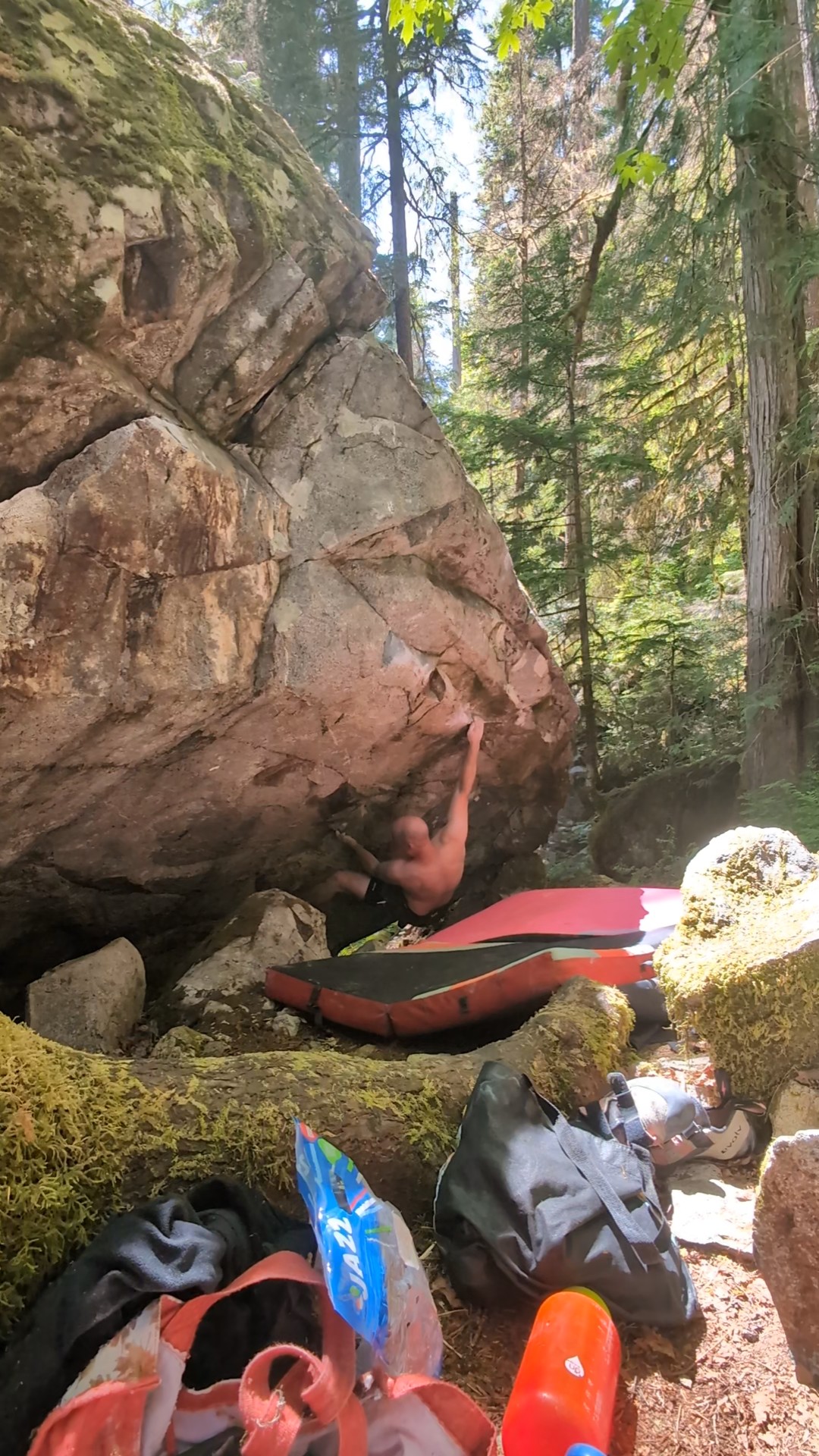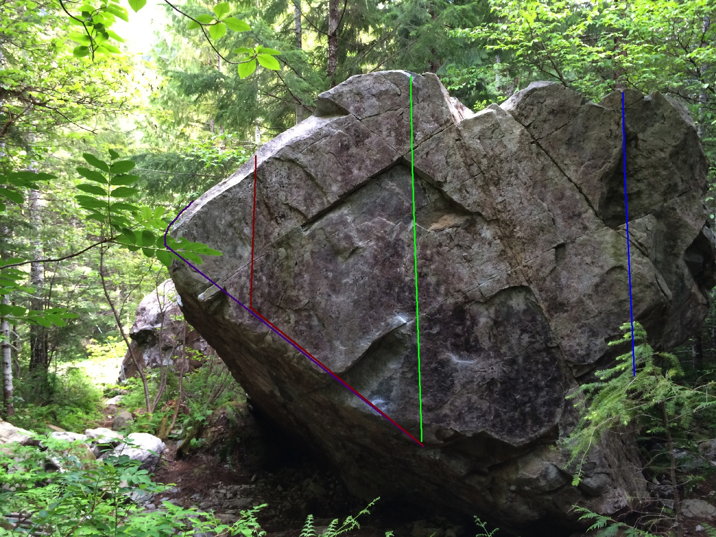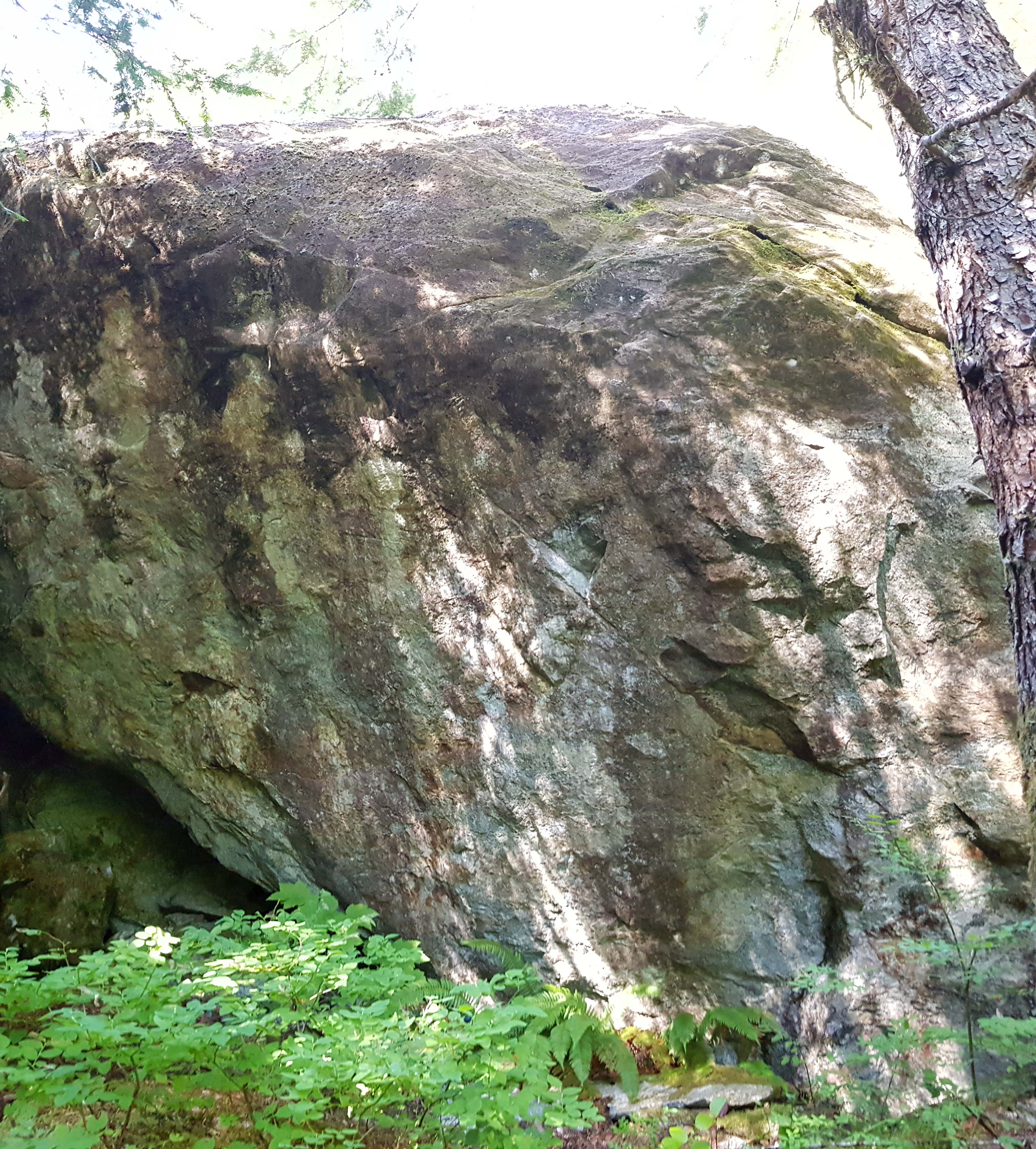 Driving from Port Alberni, the boulders are on the right side of the road, approximately 3km after the Taylor River Rest Area. As soon as the lane splits into two lanes, one of the first power poles on your right will have a climbing shoe nailed to it. The support cable on this pole is anchored to the first West Forest boulder and marks the entrance.
