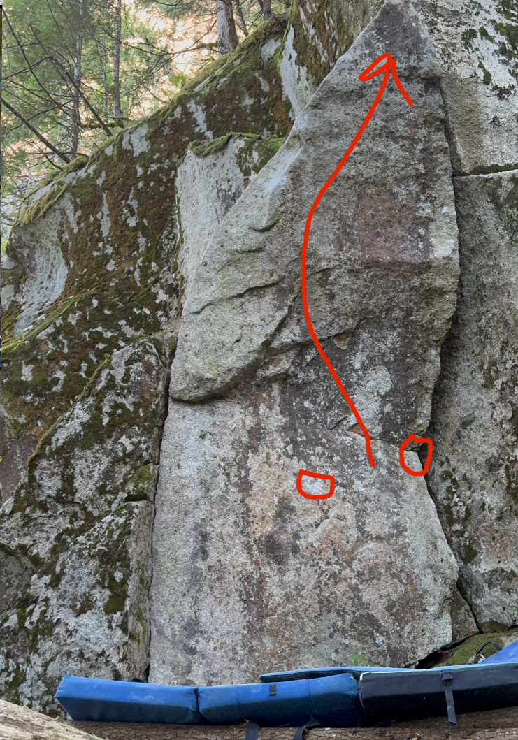 Arrowhead can be found if you follow the path up and left of Ramen Raw. Pass the Wag bag dispenser and cross a log bridge with tread markings carved into it. Follow this trail up for a bit until you reach the beginning of the South Gully talus. Cross over the talus into the forest and follow a few cairns. There will be a short wall eventually up the hill and on the left and Arrowhead will be found on the downhill side of that short wall.