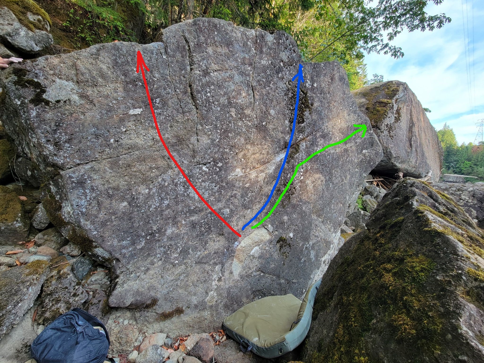 On the up river side of the Thic Boi boulder. Start matched on the undercling, finish up and left.