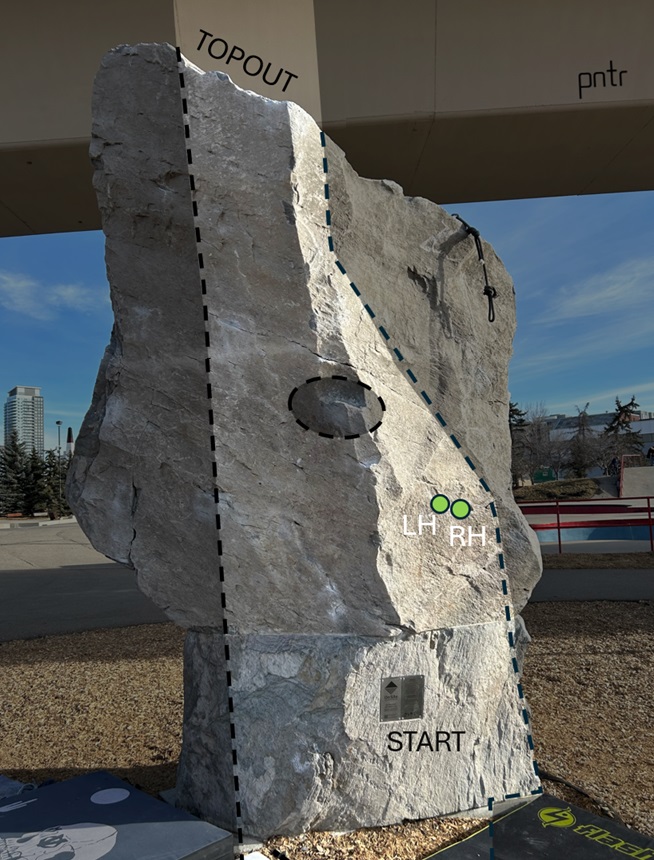 Really good variation of Rhino Dyno Low. Start matched on the glassy crimp rail, you get the foot chip on the low right arete to start (not the concrete). Move left onto the thin face then straight up. The big jug in the middle is out, the crimps above and below it are in.