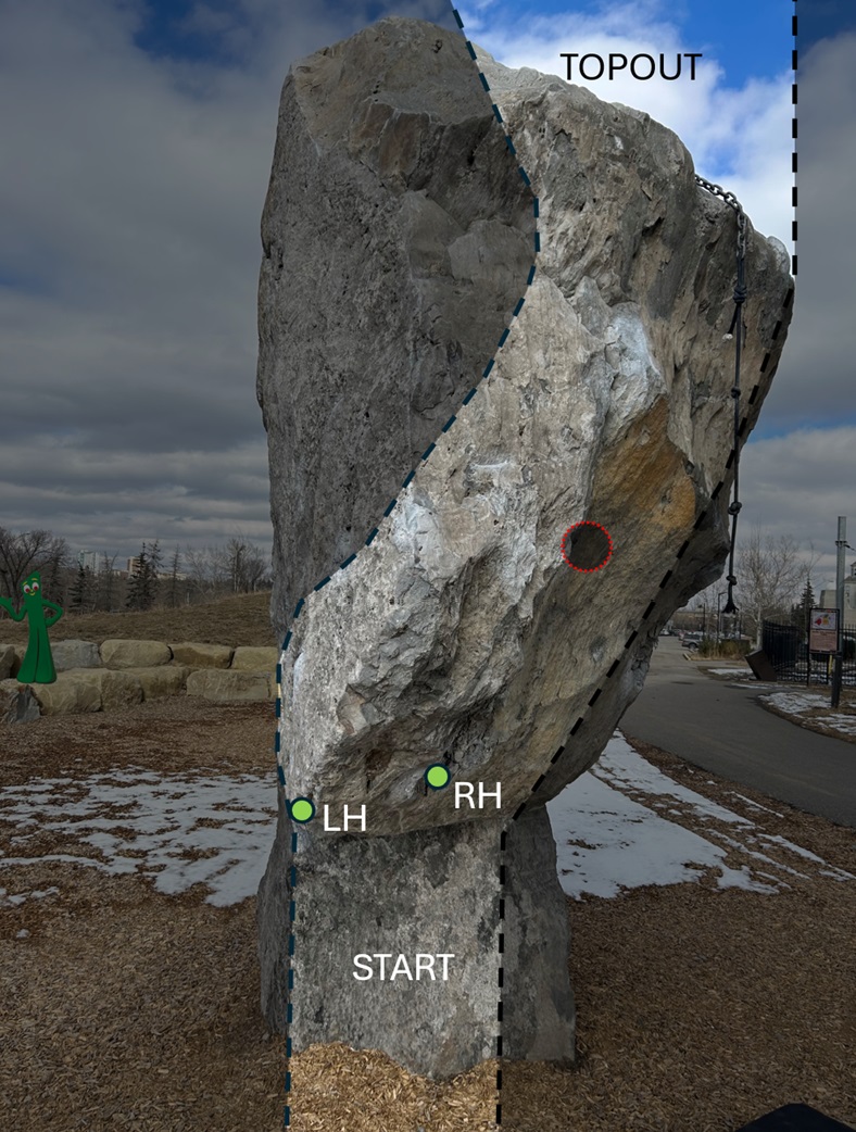 Sit start, left hand near bottom of the arete and right hand in the pocket. The jug around the left wall is in and makes for enjoyable moves down low. Move up and right, the crux revolves around moving on and off the dreaded punter pinch! The drilled core hole is OUT.