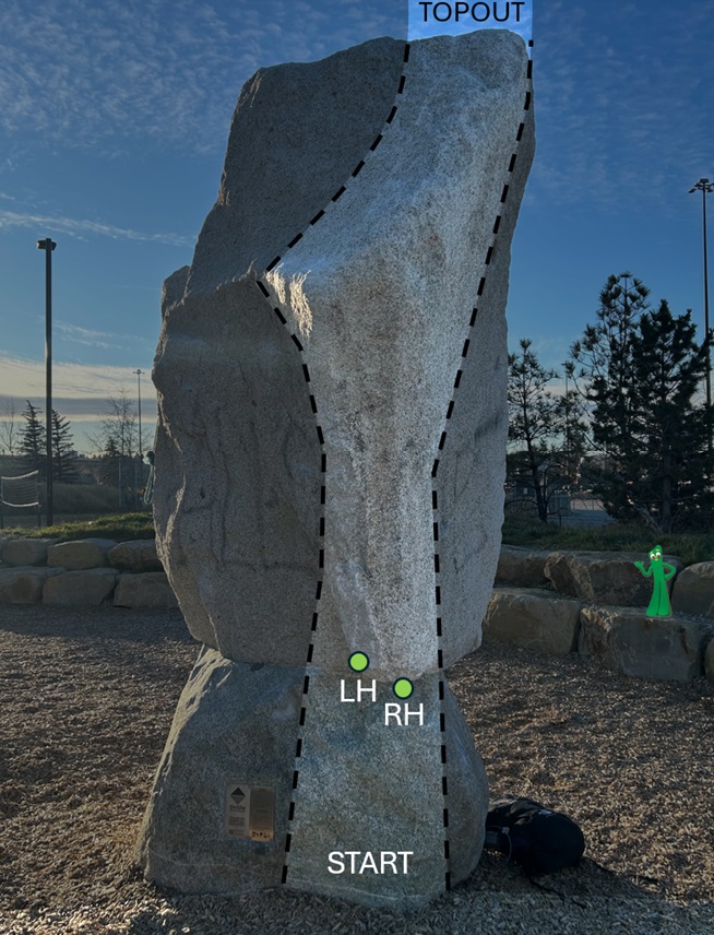 Start on the undercling and climb straight up using only the arete and sloping ledge. You can smear the right side of the arete but the manufactured pockets are out. The left face where the good holds and crucial high foot of “Slip Slap Slop” is out!